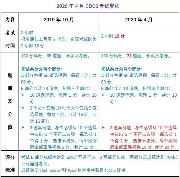 Section B 包含10道单选题、3个in-basket document案例分析(共15道题)、3个simulation document 找不符点 案例(共15道题)。 2020年开始CDCS考试有变化,如下图: